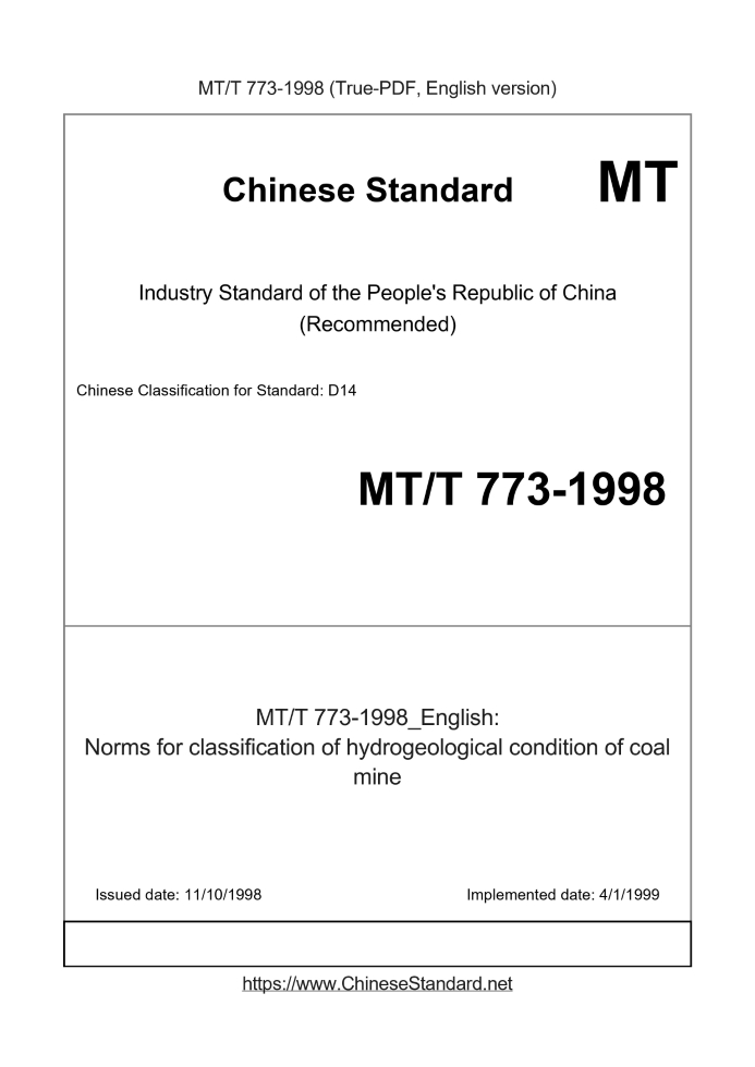 | MT/T 773-1998 English PDFUS$279.00 · In stock Delivery: <= 3 days. True-PDF full-copy in English will be manually translated and delivered via email. MT/T 773-1998: Norms for classification of hydrogeological condition of coal mine Status: Obsolete