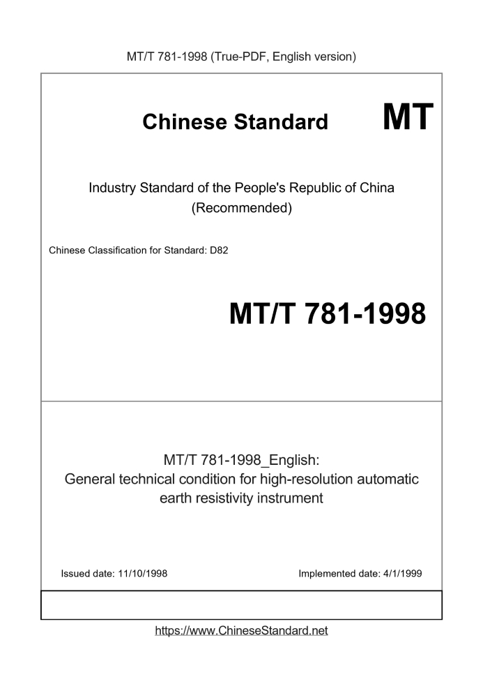 | MT/T 781-1998 English PDFUS$319.00 · In stock Delivery: <= 3 days. True-PDF full-copy in English will be manually translated and delivered via email. MT/T 781-1998: General technical condition for high-resolution automatic earth resistivity instrument Status: Obsolete