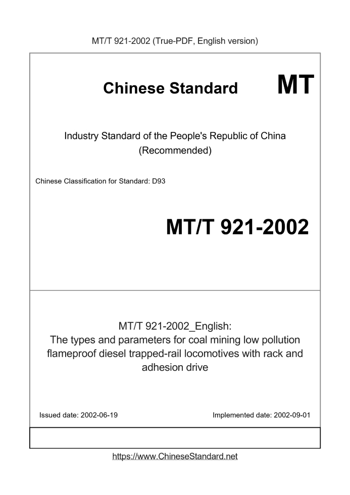 | MT/T 921-2002 English PDFUS$199.00 ยท In stock Delivery: <= 3 days. True-PDF full-copy in English will be manually translated and delivered via email. MT/T 921-2002: The types and parameters for coal mining low pollution flameproof diesel trapped-rail locomotives with rack and adhesion drive Status: Valid