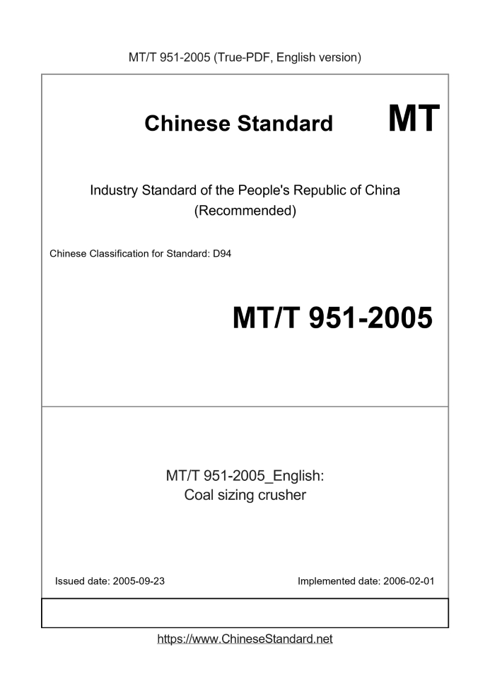 | MT/T 951-2005 English PDFUS$229.00 ยท In stock Delivery: <= 3 days. True-PDF full-copy in English will be manually translated and delivered via email. MT/T 951-2005: Coal sizing crusher Status: Valid