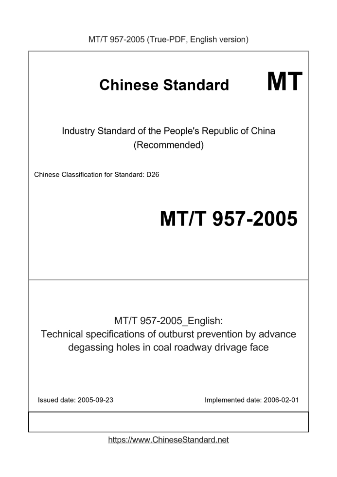 | MT/T 957-2005 English PDFUS$259.00 ยท In stock Delivery: <= 3 days. True-PDF full-copy in English will be manually translated and delivered via email. MT/T 957-2005: Technical specifications of outburst prevention by advance degassing holes in coal roadway drivage face Status: Valid