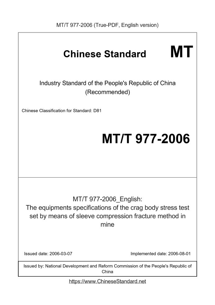 | MT/T 977-2006 English PDFUS$419.00 ยท In stock Delivery: <= 3 days. True-PDF full-copy in English will be manually translated and delivered via email. MT/T 977-2006: The equipments specifications of the crag body stress test set by means of sleeve compression fracture method in mine Status: Valid