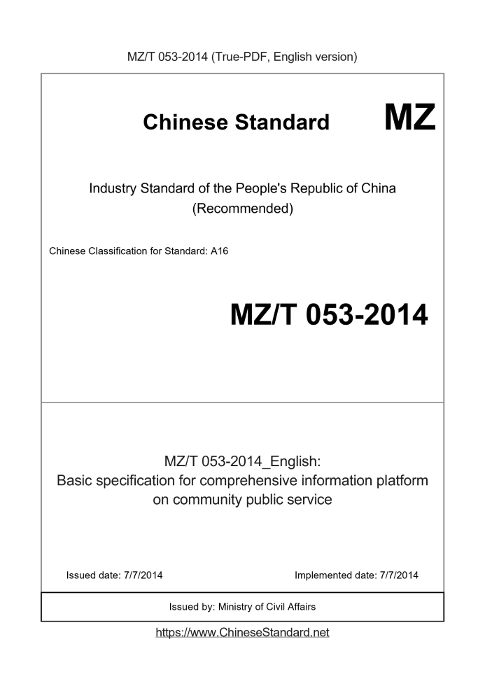 Delivery: <= 3 days. True-PDF full-copy in English will be manually translated and delivered via email. MZT053-2014: Basic specification for comprehensive information platform on community public service Status: Valid