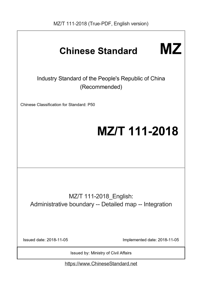 Basic dataStandard ID: MZ/T 111-2018 (MZ/T111-2018)Description (Translated English): Administrative boundary -- Detailed map -- Integration Sector / Industry: Chinese Industry Standard (Recommended) Classification of Chinese Standard: P50 Word Count Estimation: 18,115 Date of Issue: 2018-11-05 Date of Implementation: 2018-11-05 Regulation (derived from): Industry standard information service platform (2019.11.11) Issuing agency(ies): Ministry of Civil Affairs MZT111-2018: Administrative boundary -- Detailed map -- Integration---This is a DRAFT version for illustration, not a final translation. Full copy of true-PDF in English version (including equations, symbols, images, flow-chart, tables, and figures etc.) will be manually/carefully translated upon your order.(Administrative District Boundary Detail Integration) ICS 01.040.03 P50 MZ Civil Administration Industry Standards of the People's Republic of China Administrative area boundary detail integration Administrative boundary-Detailed map-Integration 2018-11-05 released 2018-11-05 implementation Published by the Ministry of Civil Affairs of the People's Republic of China ContentsForeword ... II 1 Scope ... 1 2 Normative references ... 1 3 Terms and definitions ... 1 4 Atlas content and presentation ... 1 5 Atlas cover ... 2 6 Atlas sequence diagram ... 2 7 Enclosure cover ... 4 8 Integration ... 4 9 Picture finishing ... 5 10 Binding ... 5 Appendix A (Normative Appendix) Schematic Design of Atlas Cover Page ... 7 Appendix B (Normative Appendix) Schematic Diagram of Atlas Compilation Instruction Page ... 8 Appendix C (Normative Appendix) Schematic diagram of the design of chart page ... 9 Appendix D (Normative Appendix) Atlas of Legend Page Layout Design ... 11 Appendix E (Normative Appendix) Schematic of Cover Page Layout in Atlas ... 12 Appendix F (Normative Appendix) List of Detailed Use Colors ... 13 Appendix G (Normative Appendix) List of Atlas Colors ... 14 References ... 15ForewordThis standard was drafted in accordance with the rules given in GB/T 1.1-2009. This standard is proposed and managed by the Division of Geographical Names Division of the Ministry of Civil Affairs. This standard was drafted. Division of Geographical Names of the Ministry of Civil Affairs, Institute of Geographical Names of the Ministry of Civil Affairs. The main drafters of this standard. Wu Fuxiang, Zhang Qinghua, Wu Jian, Fan Rong, Yan Xueyi, and Liu Zhicong. Administrative area boundary detail integration1 ScopeThis standard specifies the terms and definitions for the detailed integration of administrative area boundary maps, the content and presentation form of the atlas, the front cover, the sequence diagram, the inner cover of the volume, Contents and requirements for integration, contouring and finishing. This standard applies to the integration of administrative area boundary maps.2 Normative referencesThe following documents are essential for the application of this document. For dated references, only the dated version applies to this document. For undated references, the latest version (including all amendments) applies to this document. GB/T 14511 Map Printing Specifications GB/T 23758 industrial parchment GB/T 10335.1 coated paper and cardboard coated art printing paper (coated paper) MZ/T 069-2016 Provincial-level Joint Inspection3 terms and definitionsThe following terms and definitions apply to this document. 3.1 Administrative boundary The relevant people's governments adjacent to the administrative regions approved by the people's governments of the State Council or provinces, autonomous regions, and municipalities directly under the Central Government exercise jurisdiction over the administrative regions Right dividing line. [MZ/T 069-2016, definition 3.1] 3.2 Boundary detailed map Thematic maps that reflect the standard drawing of administrative area boundaries. 3.3 Boundary detailed map series Thematic atlases that summarize detailed line drawings together as required.4 Atlas content and presentation4.1 Atlas content Including the cover, sequence diagram (including compilation instructions, detailed drawings and charts, legends), the inside of the volume and the detailed line drawing (the main part). 4.2 Presentation The atlas uses a horizontal version of the folio, the finished layout size is 75 cm from east to west, and 52 cm from north to south. Atlases are grouped in volumes. -Atlas of provincial administrative area boundaries uses each administrative area boundary as a unit volume; -Atlases of administrative regions below the provincial level are organized in units of administrative regions; --Longer boundaries can be divided into separate volumes (generally detailed page > 80 pages).5 Gallery Covers5.1 Cover Content The cover content may consist of the national emblem pattern, the main name of the atlas, the compilation unit and the compilation time. 5.2 Typographic Design The layout design requires dignity and beauty. For specific styles, refer to Appendix A.6 Atlas sequence diagram6.1 Composition The sequence diagram is composed of three parts. the instruction page, the chart page, and the legend page. 6.2 Preparation of instruction pages Refer to Appendix B for the description page style. The page content consists of the following three parts. -Schematic diagram of the position of the boundary line. indicate the position of the boundary line in the upper administrative area; -Compilation information. the list of compilation committees, editorial departments and editors at all levels of the atlas should be included; -Compilation instructions should include the following. A brief description of the physical geography of the border areas, an overview of the work of delineation and its significance; the basis and purpose of the mapping; The scale and coordinate system of the atlas compilation; Mapping methods and software used; compiling information and processing methods; Number of drawings, layout structure and drawing metho