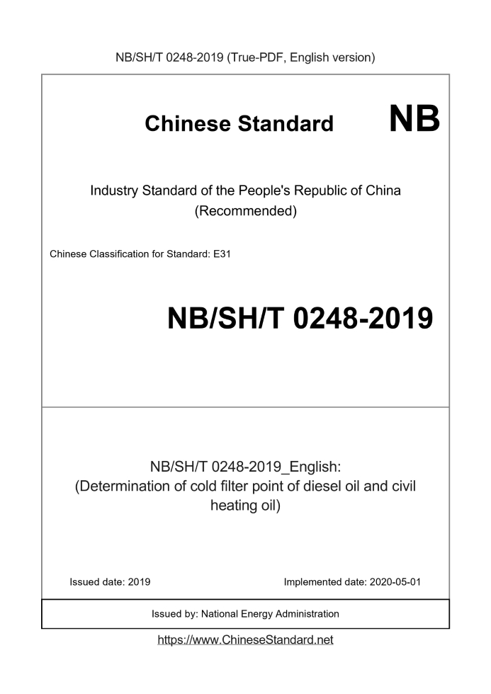 Delivery: <= 3 days. True-PDF full-copy in English will be manually translated and delivered via email. NBSHT0248-2019: (Determination of cold filter point of diesel oil and civil heating oil) Status: Valid