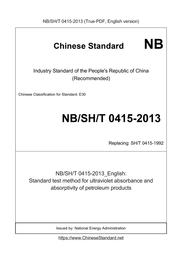 Delivery: <= 3 days. True-PDF full-copy in English will be manually translated and delivered via email. NBSHT0415-2013: Standard test method for ultraviolet absorbance and absorptivity of petroleum products Status: Valid