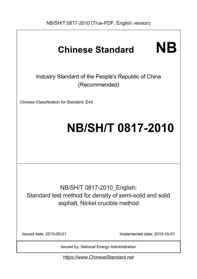 Delivery: <= 3 days. True-PDF full-copy in English will be manually translated and delivered via email. NBSHT0817-2010: Standard test method for density of semi-solid and solid asphalt. Nickel crucible method Status: Valid