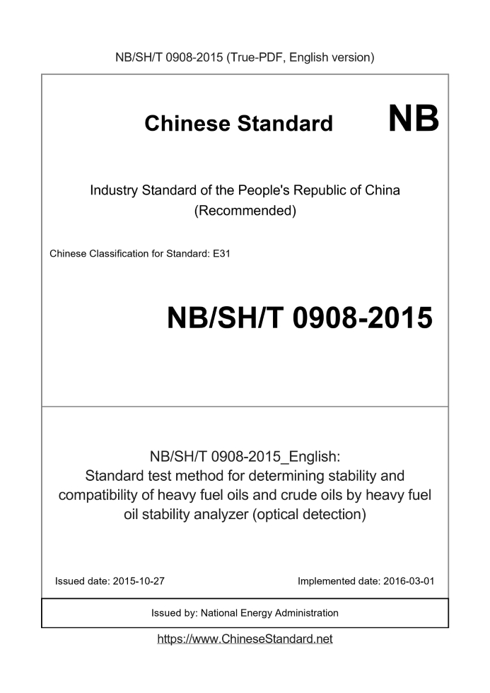 Delivery: <= 3 days. True-PDF full-copy in English will be manually translated and delivered via email. NBSHT0908-2015: Standard test method for determining stability and compatibility of heavy fuel oils and crude oils by heavy fuel oil stability analyzer (optical detection) Status: Valid