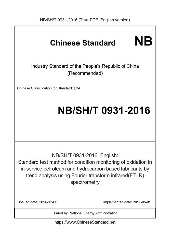 Delivery: <= 3 days. True-PDF full-copy in English will be manually translated and delivered via email. NBSHT0931-2016: Standard test method for condition monitoring of oxidation in in-service petroleum and hydrocarbon based lubricants by trend analysis using Fourier transform infrared(FT-IR) spectrometry Status: Valid