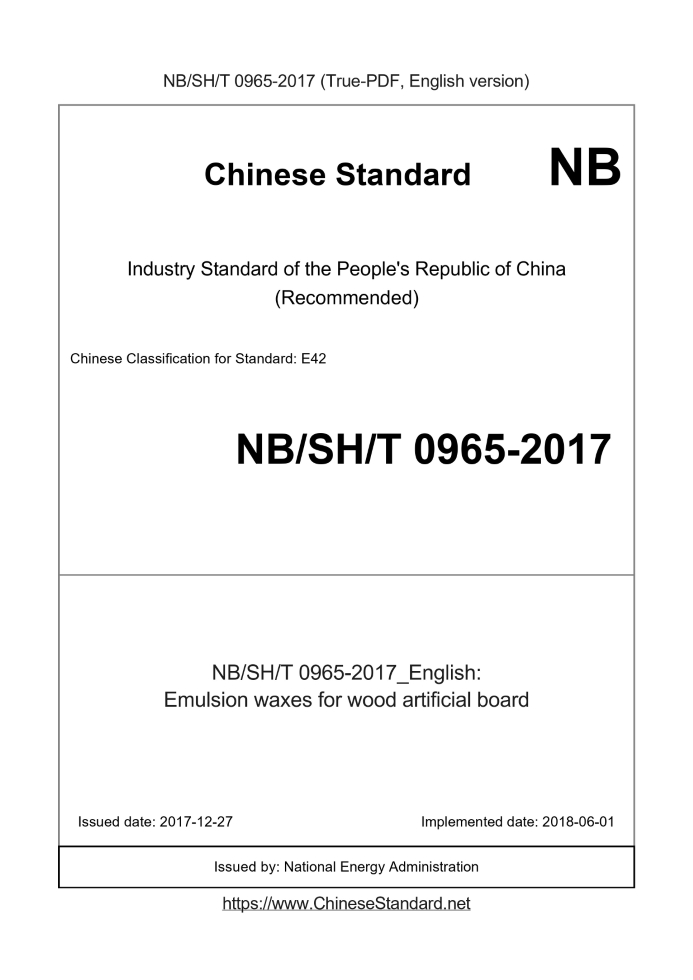 Delivery: <= 2 days. True-PDF full-copy in English will be manually translated and delivered via email. NBSHT0965-2017: Emulsion waxes for wood artificial board Status: Valid