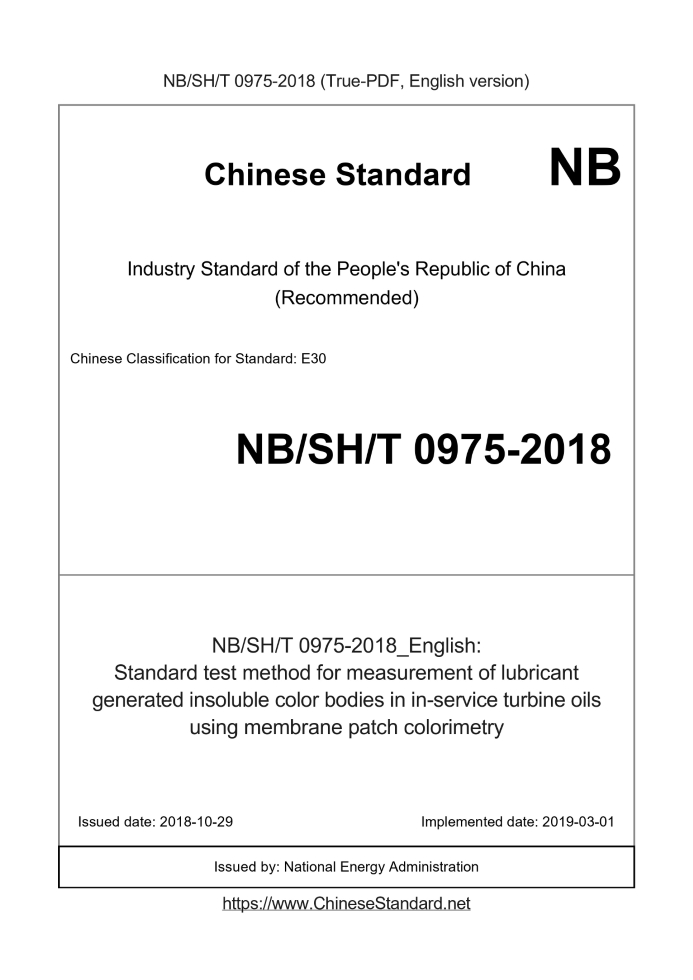 Delivery: <= 3 days. True-PDF full-copy in English will be manually translated and delivered via email. NBSHT0975-2018: Standard test method for measurement of lubricant generated insoluble color bodies in in-service turbine oils using membrane patch colorimetry Status: Valid