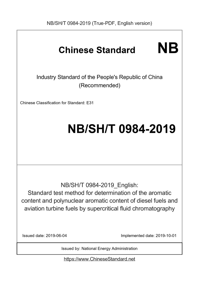 Delivery: <= 3 days. True-PDF full-copy in English will be manually translated and delivered via email. NBSHT0984-2019: Standard test method for determination of the aromatic content and polynuclear aromatic content of diesel fuels and aviation turbine fuels by supercritical fluid chromatography Status: Valid