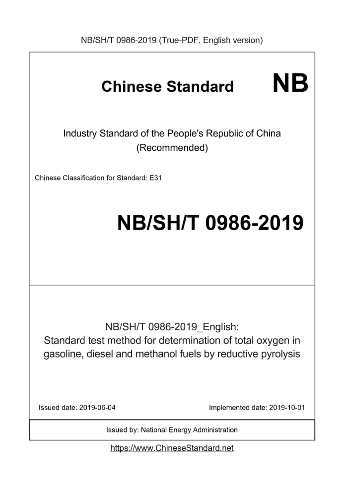 Delivery: <= 3 days. True-PDF full-copy in English will be manually translated and delivered via email. NBSHT0986-2019: Standard test method for determination of total oxygen in gasoline, diesel and methanol fuels by reductive pyrolysis Status: Valid