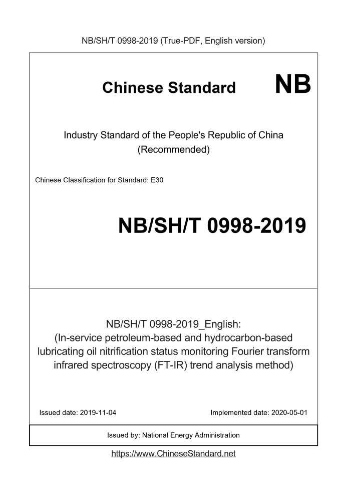 | NBSHT0998-2019 English PDFUS$259.00 ยท In stock Delivery: <= 3 days. True-PDF full-copy in English will be manually translated and delivered via email. NBSHT0998-2019: (In-service petroleum-based and hydrocarbon-based lubricating oil nitrification status monitoring Fourier transform infrared spectroscopy (FT-IR) trend analysis method) Status: Valid