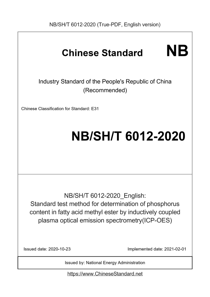Delivery: <= 3 days. True-PDF full-copy in English will be manually translated and delivered via email. NBSHT6012-2020: Standard test method for determination of phosphorus content in fatty acid methyl ester by inductively coupled plasma optical emission spectrometry(ICP-OES) Status: Valid