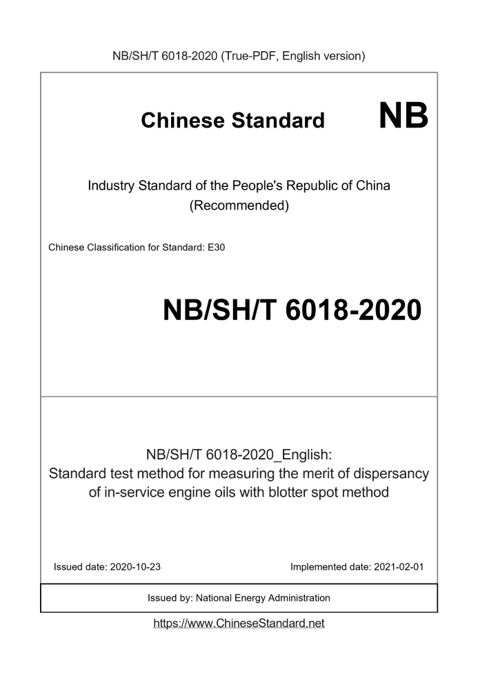 Delivery: <= 3 days. True-PDF full-copy in English will be manually translated and delivered via email. NBSHT6018-2020: Standard test method for measuring the merit of dispersancy of in-service engine oils with blotter spot method Status: Valid