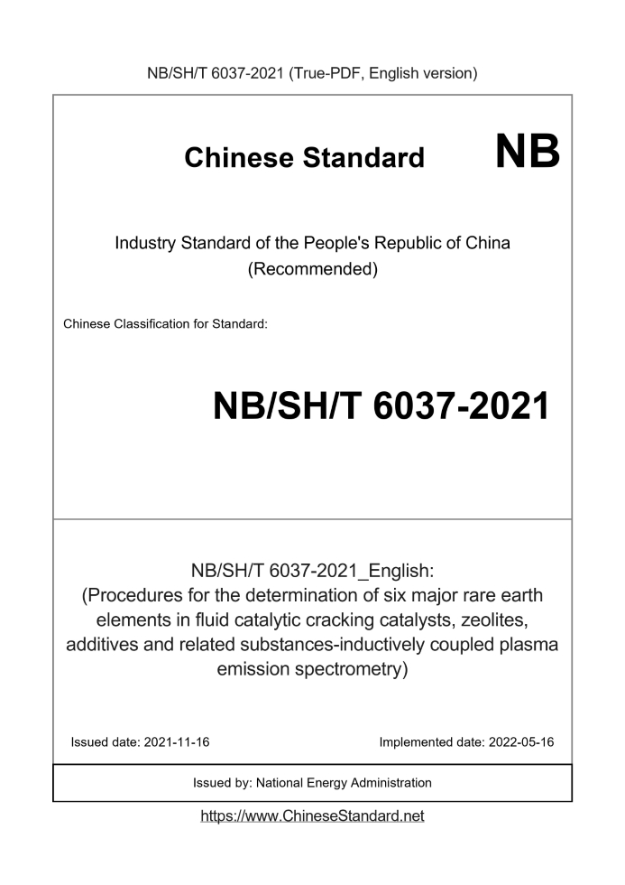 Delivery: <= 3 days. True-PDF full-copy in English will be manually translated and delivered via email. NBSHT6037-2021: (Procedures for the determination of six major rare earth elements in fluid catalytic cracking catalysts, zeolites, additives and related substances-inductively coupled plasma emission spectrometry) Status: Valid