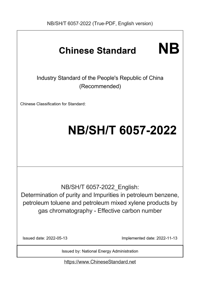 Delivery: <= 3 days. True-PDF full-copy in English will be manually translated and delivered via email. NBSHT6057-2022: Determination of purity and Impurities in petroleum benzene, petroleum toluene and petroleum mixed xylene products by gas chromatography - Effective carbon number Status: Valid