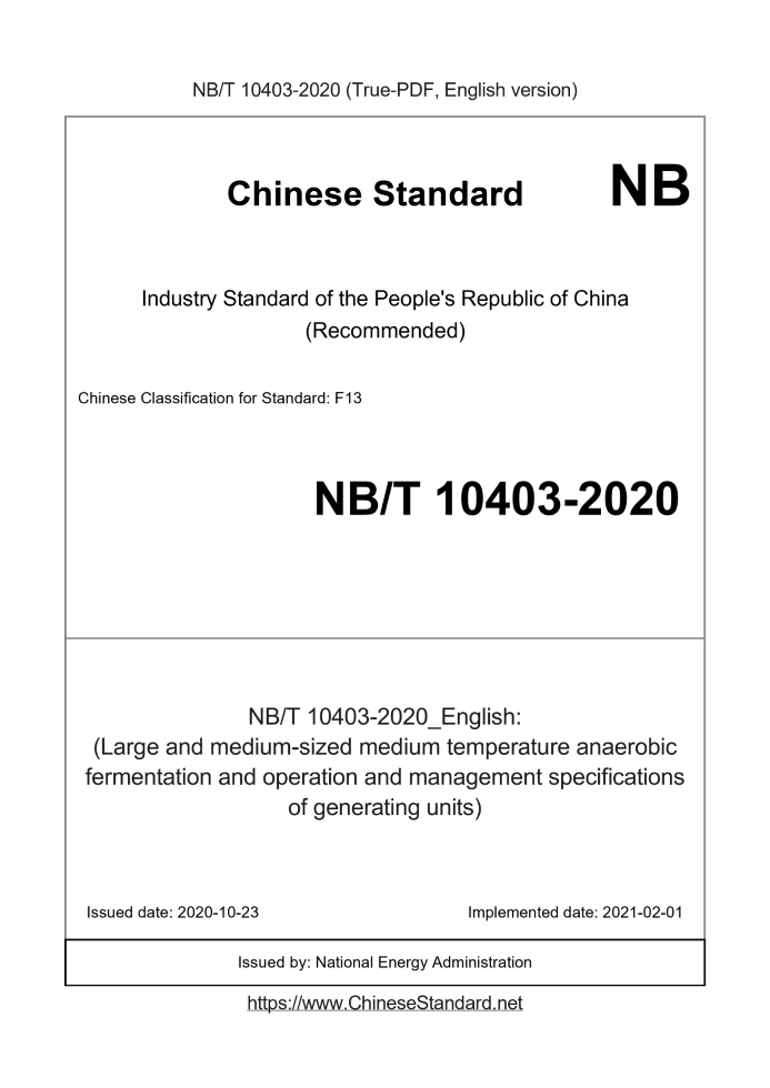 Delivery: <= 4 days. True-PDF full-copy in English will be manually translated and delivered via email. NB/T 10403-2020: (Large and medium-sized medium temperature anaerobic fermentation and operation and management specifications of generating units) Status: Valid
