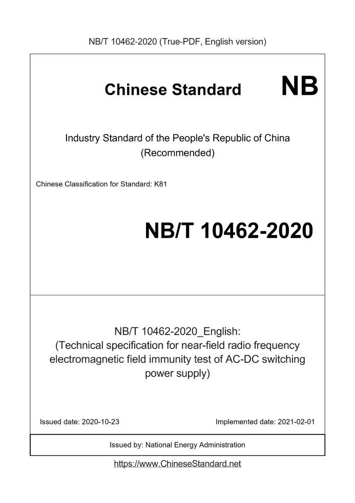 Delivery: <= 3 days. True-PDF full-copy in English will be manually translated and delivered via email. NB/T 10462-2020: (Technical specification for near-field radio frequency electromagnetic field immunity test of AC-DC switching power supply) Status: Valid