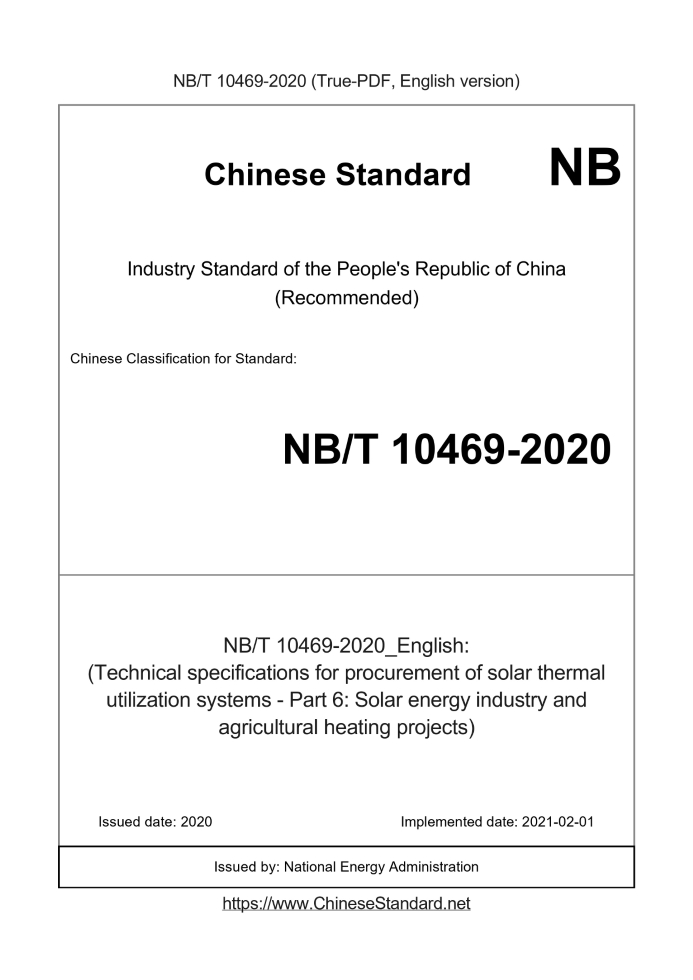 Basic dataStandard ID: NB/T 10469-2020 (NB/T10469-2020)Description (Translated English): (Technical specifications for procurement of solar thermal utilization systems - Part 6: Solar energy industry and agricultural heating projects) Sector / Industry: Energy Industry Standard (Recommended) Date of Issue: 2020 Date of Implementation: 2021-02-01 Issuing agency(ies): National Energy Administration Tips & Frequently Asked Questions:Question 1: How long will the true-PDF of NB/T 10469-2020_English be delivered?Answer: Upon your order, we will start to translate NB/T 10469-2020_English as soon as possible, and keep you informed of the progress. The lead time is typically 1 ~ 3 working days. The lengthier the document the longer the lead time.Question 2: Can I share the purchased PDF of NB/T 10469-2020_English with my colleagues?Answer: Yes. The purchased PDF of NB/T 10469-2020_English will be deemed to be sold to your employer/organization who actually pays for it, including your colleagues and your employer's intranet.Question 3: Does the price include tax/VAT?Answer: Yes. Our tax invoice, downloaded/delivered in 9 seconds, includes all tax/VAT and complies with 100+ countries' tax regulations (tax exempted in 100+ countries) -- See Avoidance of Double Taxation Agreements (DTAs): List of DTAs signed between Singapore and 100+ countriesQuestion 4: Do you accept my currency other than USD?Answer: Yes. If you need your currency to be printed on the invoice, please write an email to Sales@ChineseStandard.net. In 2 working-hours, we will create a special link for you to pay in any currencies. Otherwise, follow the normal steps: Add to Cart -- Checkout -- Select your currency to pay. |
