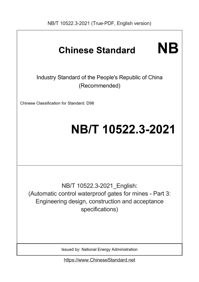 Delivery: <= 3 days. True-PDF full-copy in English will be manually translated and delivered via email. NB/T 10522.3-2021: (Automatic control waterproof gates for mines - Part 3: Engineering design, construction and acceptance specifications) Status: Valid
