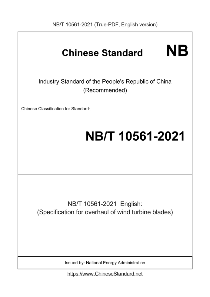 Delivery: <= 3 days. True-PDF full-copy in English will be manually translated and delivered via email. NB/T 10561-2021: (Specification for overhaul of wind turbine blades) Status: Valid