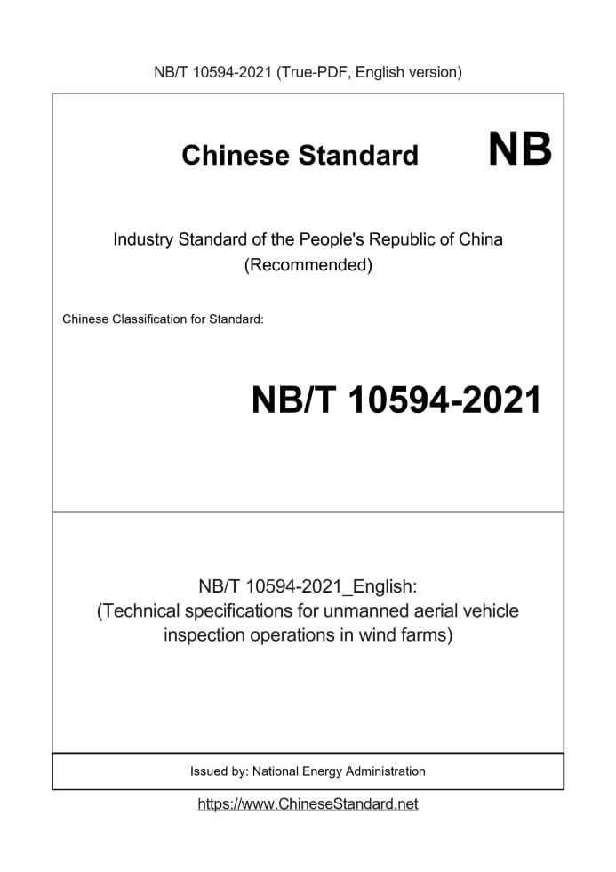 Delivery: <= 3 days. True-PDF full-copy in English will be manually translated and delivered via email. NB/T 10594-2021: (Technical specifications for unmanned aerial vehicle inspection operations in wind farms) Status: Valid