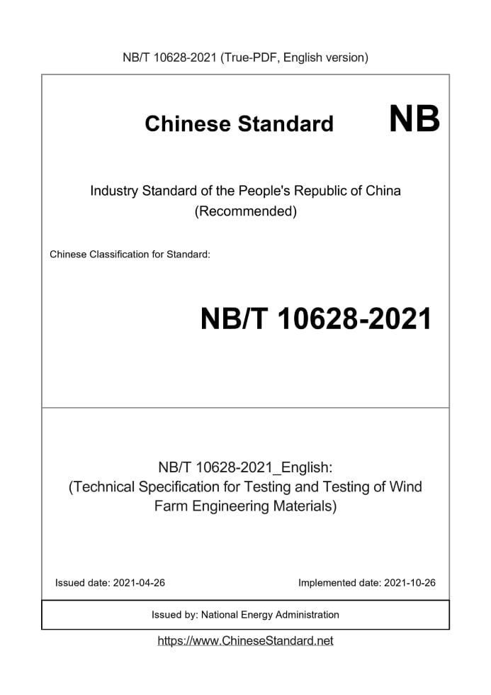Delivery: <= 10 days. True-PDF full-copy in English will be manually translated and delivered via email. NB/T 10628-2021: (Technical Specification for Testing and Testing of Wind Farm Engineering Materials) Status: Valid