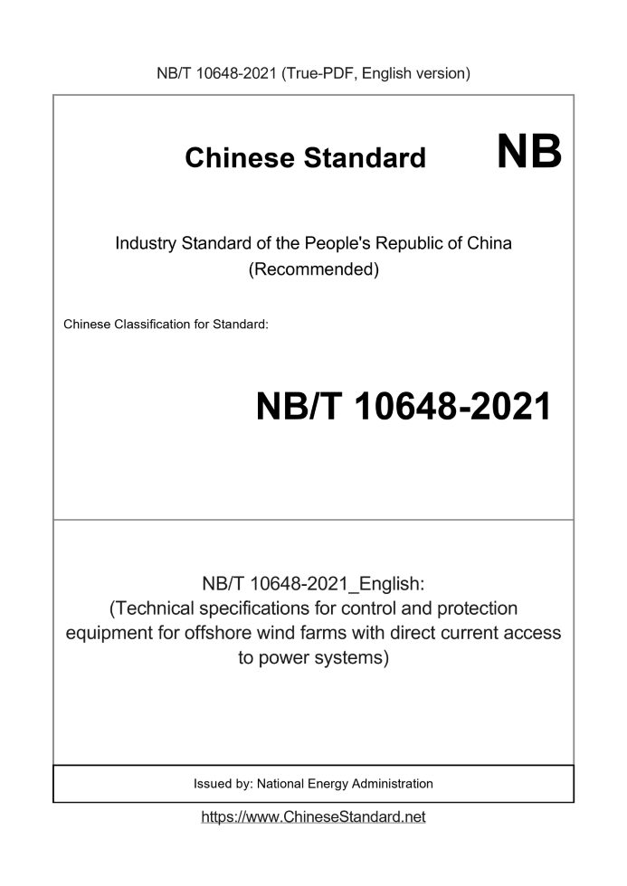 Delivery: <= 3 days. True-PDF full-copy in English will be manually translated and delivered via email. NB/T 10648-2021: (Technical specifications for control and protection equipment for offshore wind farms with direct current access to power systems) Status: Valid