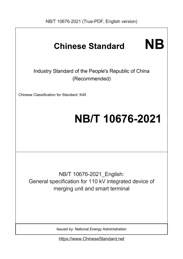 Delivery: <= 5 days. True-PDF full-copy in English will be manually translated and delivered via email. NB/T 10676-2021: General specification for 110 kV integrated device of merging unit and smart terminal Status: Valid