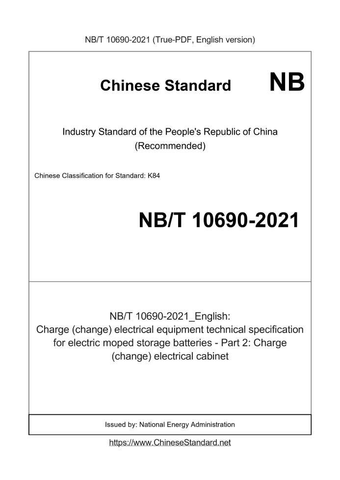 Delivery: <= 3 days. True-PDF full-copy in English will be manually translated and delivered via email. NB/T 10690-2021: Charge (change) electrical equipment technical specification for electric moped storage batteries - Part 2: Charge (change) electrical cabinet Status: Valid
