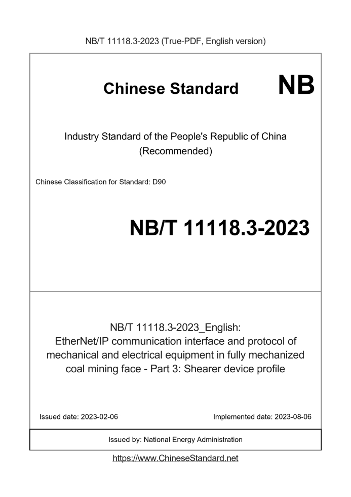 Basic dataStandard ID: NB/T 11118.3-2023 (NB/T11118.3-2023)Description (Translated English): EtherNet/IP communication interface and protocol of mechanical and electrical equipment in fully mechanized coal mining face - Part 3: Shearer device profile Sector / Industry: Energy Industry Standard (Recommended) Classification of Chinese Standard: D90 Classification of International Standard: 73.100.01 Word Count Estimation: 19,156 Date of Issue: 2023-02-06 Date of Implementation: 2023-08-06 Issuing agency(ies): National Energy Administration NB/T 11118.3-2023: EtherNet/IP communication interface and protocol of mechanical and electrical equipment in fully mechanized coal mining face - Part 3: Shearer device profile---This is a DRAFT version for illustration, not a final translation. Full copy of true-PDF in English version (including equations, symbols, images, flow-chart, tables, and figures etc.) will be manually/carefully translated upon your order. ICS 73.100.01 CCSD90 Energy Industry Standards of the People's Republic of China Coal mine fully mechanized mining face electromechanical equipment EtherNet/IP Communication interfaces and protocols Part 3.Shearer Equipment Data Sheet Part 3.Shearerdeviceprofile 2023-08-06 Implementation Released by the National Energy Administration Table of contentsPrefaceⅠ Introduction II 1 Scope 1 2 Normative reference documents 1 3 Terms and Definitions 1 4 Coal shearer equipment data sheet 1 4.1 Device type number 1 4.2 Device Object Model 1 4.3 Coal shearer cutting object example 2 4.4 Shearer traction object example 2 4.5 Coal shearer I/O combination object example 3 4.6 Device data format 3 4.7 Device configuration 13 Reference 14ForewordThis document complies with the regulations of GB/T 1.1-2020 "Standardization Work Guidelines Part 1.Structure and Drafting Rules of Standardization Documents" Custom drafting. This document is Part 3 of NB/T 11118 "EtherNet/IP Communication Interface and Protocol for Mechanical and Electrical Equipment in Coal Mining Faces". NB/T 11118 has published the following parts. ---Part 1.General provisions; ---Part 2.Extended Object Library; ---Part 3.Coal shearer equipment data sheet; ---Part 4.Hydraulic support equipment data sheet; ---Part 5.Liquid supply system equipment data sheet; ---Part 6.Scraper conveyor, transfer machine and crusher equipment data sheet; ---Part 7.Mobile substation equipment data sheet; ---Part 8.Low-voltage AC vacuum feed switchgear data sheet; ---Part 9.Multi-circuit low-voltage AC vacuum electromagnetic starter equipment data sheet; ---Part 10.Low-voltage AC vacuum electromagnetic starter equipment data sheet; ---Part 11.Lighting signal comprehensive protection device equipment data sheet. Please note that some content in this document may be subject to patents. The publisher of this document assumes no responsibility for identifying patents. This document is proposed by the China Coal Industry Association. This document is under the jurisdiction of the Standardization Expert Group of China Coal Industry Association. This document was drafted by. Guoneng Shendong Coal Group Co., Ltd., Beijing Tianma Intelligent Control Technology Co., Ltd., China Coal Engineering Industry Association Productivity Center. The main drafters of this document. Yang Peng, Huang Zenghua, He Haitao, Feng Yinhui, Wang Yongjun, Han Zhongli, Li Jing, Yang Yang, Wang Bo, Wang Ergang, Wang Zhanfei, Wang Xufeng, Wang Kai, Zhang Le, Li Bo.IntroductionNB/T 11118 "EtherNet/IP Communication Interface and Protocol for Mechanical and Electrical Equipment of Coal Mine Fully Mechanized Mining Face" establishes the fully mechanized coal mine working face machine Technical specifications for electrical equipment using EtherNet/IP Ethernet communication, which can be regarded as a reference to GB/Z 26157 (all parts) "Measurement and Control Digital Fieldbus type 2 for data communication industrial control systems. Extensions of ControlNet and EtherNet/IP specifications, mainly reflected in. Logarithmic According to the provisions of the link layer wireless interface, the object library and device profile are expanded, and the data types are expanded. NB/T 11118 by Composed of eleven parts. ---Part 1.General principles. The purpose is to determine the physical layer and data link of EtherNet/IP communication for electromechanical equipment in fully mechanized coal mining working faces. The road layer, network layer, transport layer, presentation layer, and application layer stipulate the security requirements and data types of the equipment. ---Part 2.Extending the object library. The purpose is to define an object model library suitable for electromechanical equipment in coal mine fully mechanized mining faces. ---Part 3.Shearer equipment data sheet. The purpose is to determine the equipment object model composition, object interface and access of the shearer specification. ---Part 4.Hydraulic support equipment data sheet. The purpose is to determine the equipment object model composition, object interface and access of the hydraulic support. Ask about specifications. ---Part 5.Liquid supply system equipment data sheet. The purpose is to determine the equipment object model composition, object interface and access of the liquid supply system. Ask about specifications. ---Part 6.Scraper conveyor, transfer machine and crusher equipment data sheet. The purpose is to determine the scraper conveyor and transfer machine and The equipment object model composition, object interface and access specification of the crusher. ---Part 7.Mobile substation equipment data sheet. The purpose is to determine the equipment object model composition and object interface of the mobile substation. and access specifications. ---Part 8.Low-voltage AC vacuum feed switchgear data sheet. The purpose is to determine the equipment for low voltage AC vacuum feed switches Object model composition, object interfaces and access specifications. ---Part 9.Multi-circuit