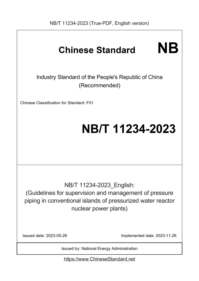 Delivery: <= 4 days. True-PDF full-copy in English will be manually translated and delivered via email. NB/T 11234-2023: (Guidelines for supervision and management of pressure piping in conventional islands of pressurized water reactor nuclear power plants) Status: Valid
