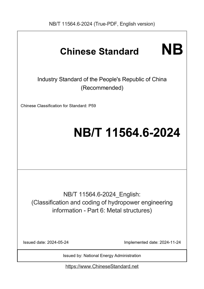 Delivery: <= 6 days. True-PDF full-copy in English will be manually translated and delivered via email. NB/T 11564.6-2024: (Classification and coding of hydropower engineering information - Part 6: Metal structures) Status: Valid