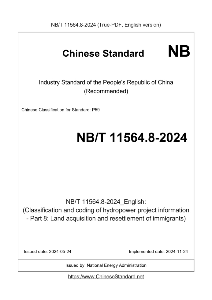 Delivery: <= 6 days. True-PDF full-copy in English will be manually translated and delivered via email. NB/T 11564.8-2024: (Classification and coding of hydropower project information - Part 8: Land acquisition and resettlement of immigrants) Status: Valid