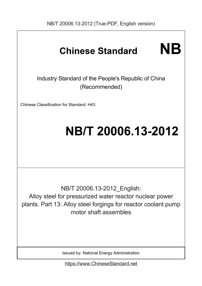 Delivery: <= 4 days. True-PDF full-copy in English will be manually translated and delivered via email. NB/T 20006.13-2012: Alloy steel for pressurized water reactor nuclear power plants. Part 13: Alloy steel forgings for reactor coolant pump motor shaft assembles Status: Valid