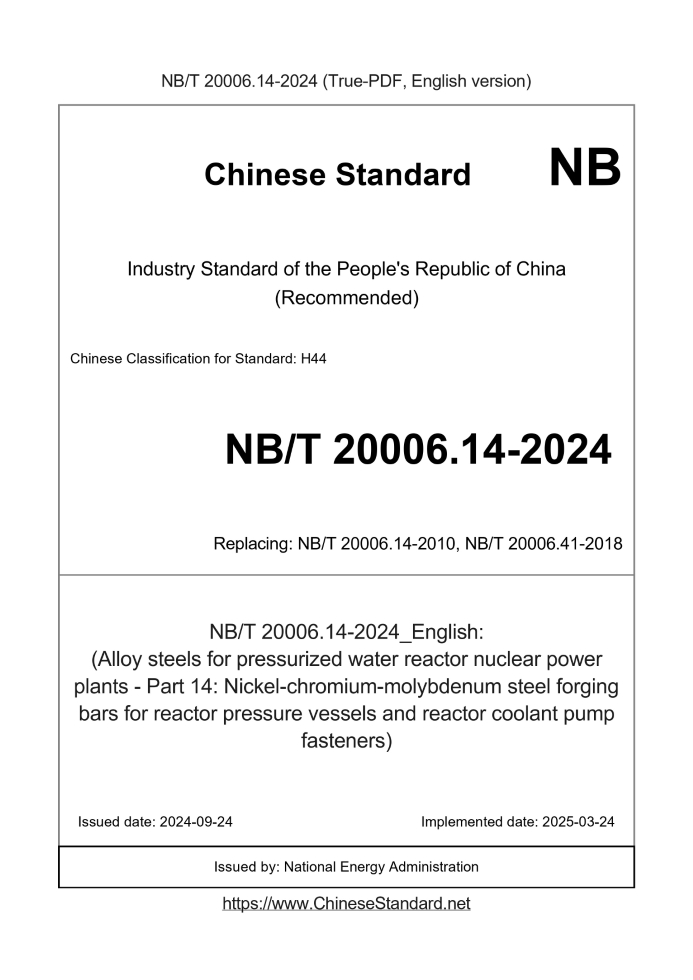 Delivery: <= 3 days. True-PDF full-copy in English will be manually translated and delivered via email. NB/T 20006.14-2024: Alloy steel for pressurized water reactor nuclear power plants - Part 14: Forged chromium-nickel-molybdenum steel bars for fasteners ofthe reactor pressure vessel and reactor coolant pump Status: Valid NB/T 20006.14: Historical versions