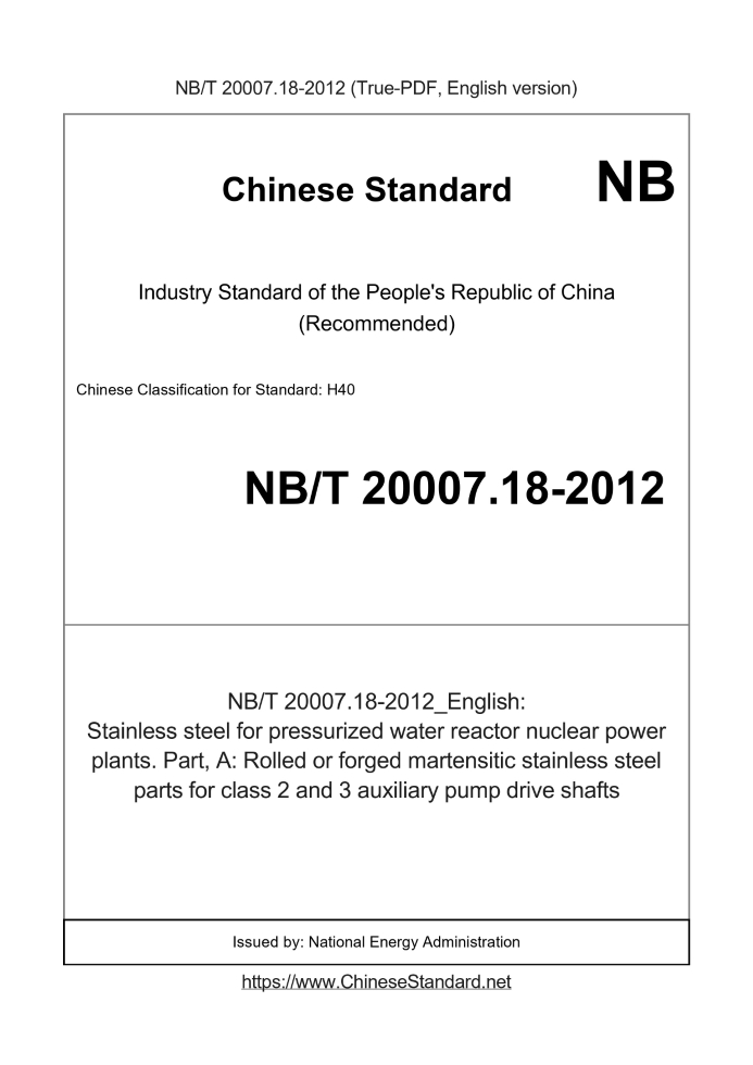 Delivery: <= 3 days. True-PDF full-copy in English will be manually translated and delivered via email. NB/T 20007.18-2012: Stainless steel for pressurized water reactor nuclear power plants. Part, A: Rolled or forged martensitic stainless steel parts for class 2 and 3 auxiliary pump drive shafts Status: Valid