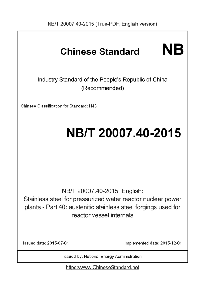 Delivery: <= 3 days. True-PDF full-copy in English will be manually translated and delivered via email. NB/T 20007.40-2015: Stainless steel for pressurized water reactor nuclear power plants - Part 40: austenitic stainless steel forgings used for reactor vessel internals Status: Valid