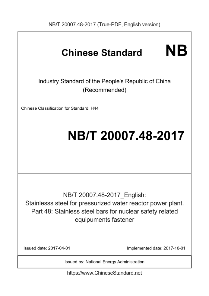 Delivery: <= 3 days. True-PDF full-copy in English will be manually translated and delivered via email. NB/T 20007.48-2017: Stainlesss steel for pressurized water reactor power plant. Part 48: Stainless steel bars for nuclear safety related equipuments fastener Status: Valid