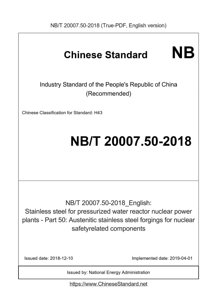 Delivery: <= 3 days. True-PDF full-copy in English will be manually translated and delivered via email. NB/T 20007.50-2018: Stainless steel for pressurized water reactor nuclear power plants - Part 50: Austenitic stainless steel forgings for nuclear safetyrelated components Status: Valid