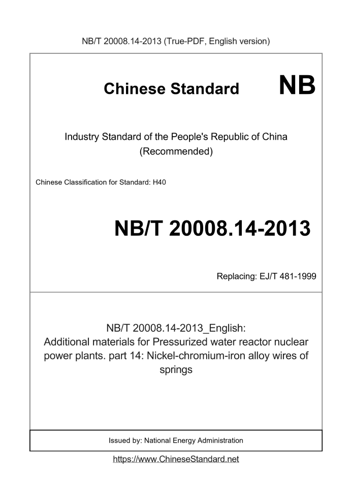 Delivery: <= 3 days. True-PDF full-copy in English will be manually translated and delivered via email. NB/T 20008.14-2013: Additional materials for Pressurized water reactor nuclear power plants. part 14: Nickel-chromium-iron alloy wires of springs Status: Valid