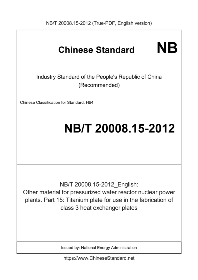 Delivery: <= 3 days. True-PDF full-copy in English will be manually translated and delivered via email. NB/T 20008.15-2012: Other material for pressurized water reactor nuclear power plants. Part 15: Titanium plate for use in the fabrication of class 3 heat exchanger plates Status: Valid