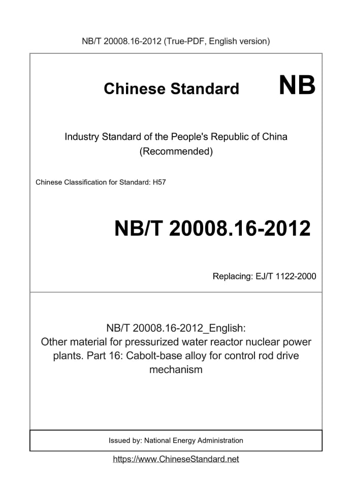 Delivery: <= 3 days. True-PDF full-copy in English will be manually translated and delivered via email. NB/T 20008.16-2012: Other material for pressurized water reactor nuclear power plants. Part 16: Cabolt-base alloy for control rod drive mechanism Status: Valid