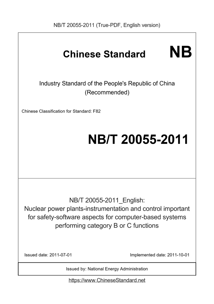 Delivery: <= 7 days. True-PDF full-copy in English will be manually translated and delivered via email. NB/T 20055-2011: Nuclear power plants-instrumentation and control important for safety-software aspects for computer-based systems performing category B or C functions Status: Valid