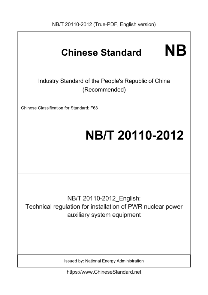 Delivery: <= 5 days. True-PDF full-copy in English will be manually translated and delivered via email. NB/T 20110-2012: Technical regulation for installation of PWR nuclear power auxiliary system equipment Status: Valid
