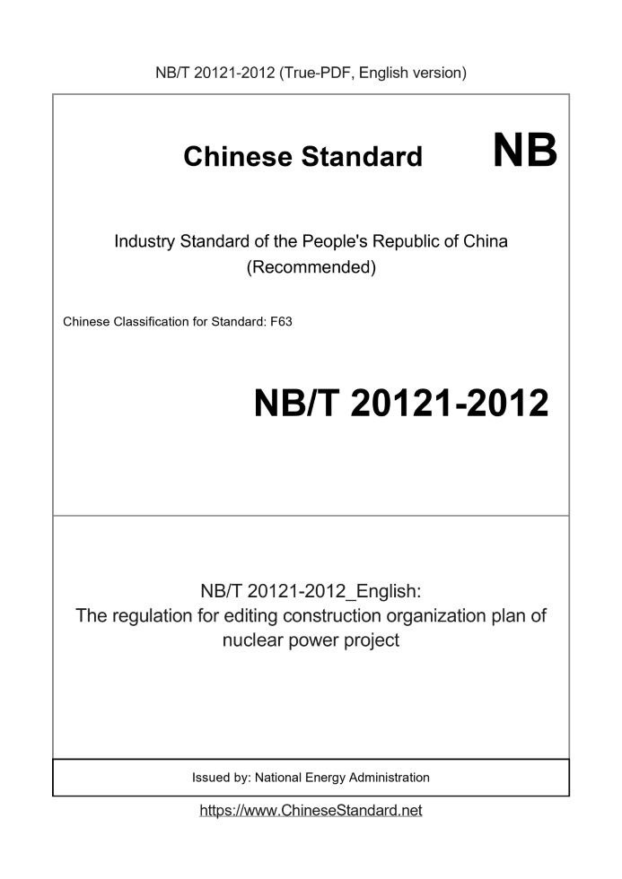 Delivery: <= 4 days. True-PDF full-copy in English will be manually translated and delivered via email. NB/T 20121-2012: The regulation for editing construction organization plan of nuclear power project Status: Valid