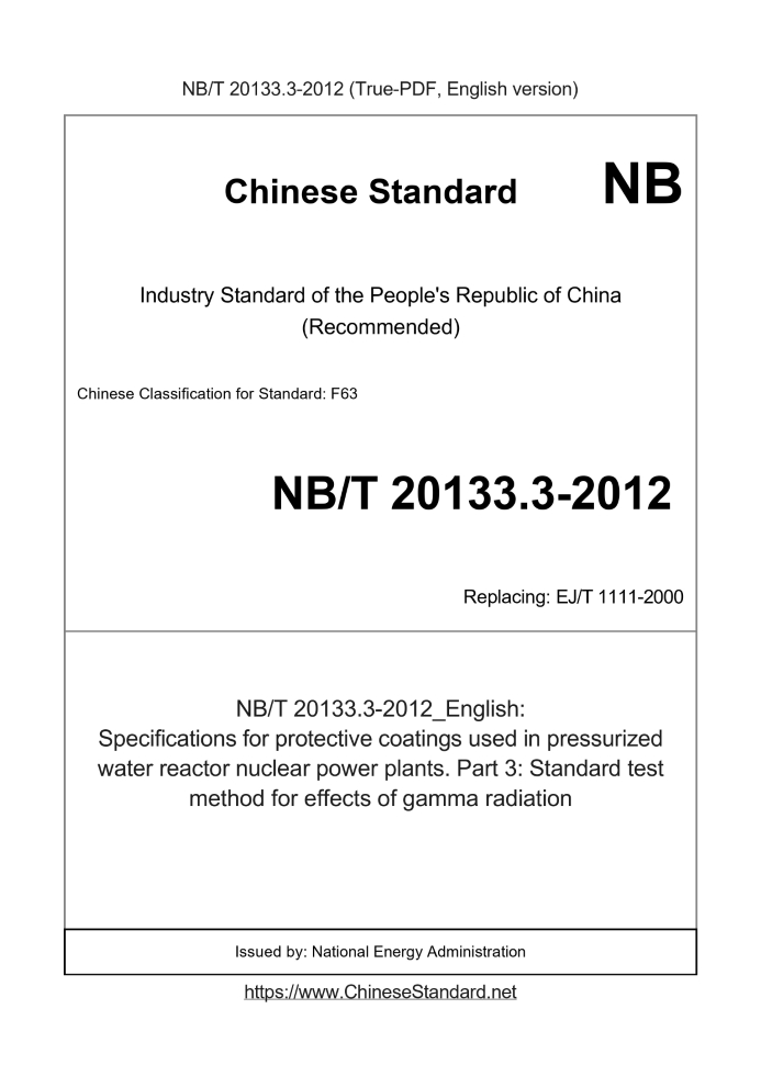 Delivery: <= 3 days. True-PDF full-copy in English will be manually translated and delivered via email. NB/T 20133.3-2012: Specifications for protective coatings used in pressurized water reactor nuclear power plants. Part 3: Standard test method for effects of gamma radiation Status: Valid