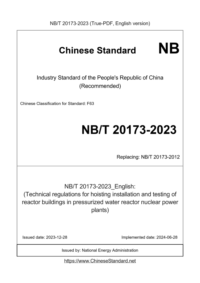 NB/T 20173-2023RFQ ASK 3 days (Technical regulations for hoisting installation and testing of reactor buildings in pressurized water reactor nuclear power plants) Valid